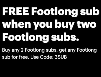 Buy any 2 Footlong subs, get any Footlong sub for free. Use Code: 3SUB โ